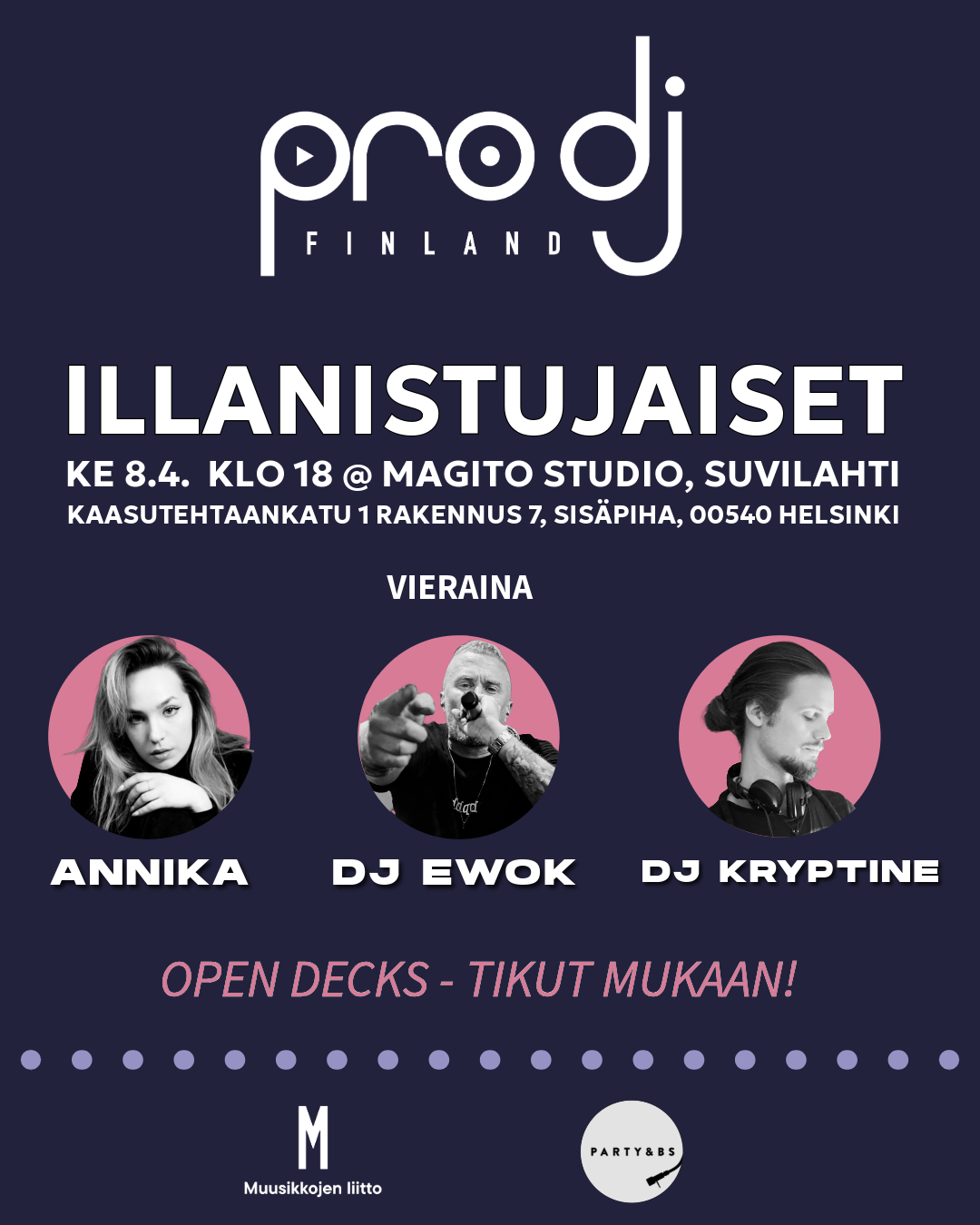 We are dedicated to empower, support and advocate for DJs of all levels, from aspiring talents to seasoned pros and to provide a networking and support platform for all our members. We are also a division of Finnish Musicians' Union and stand for the interests of DJs and Producer-DJs in Finland.